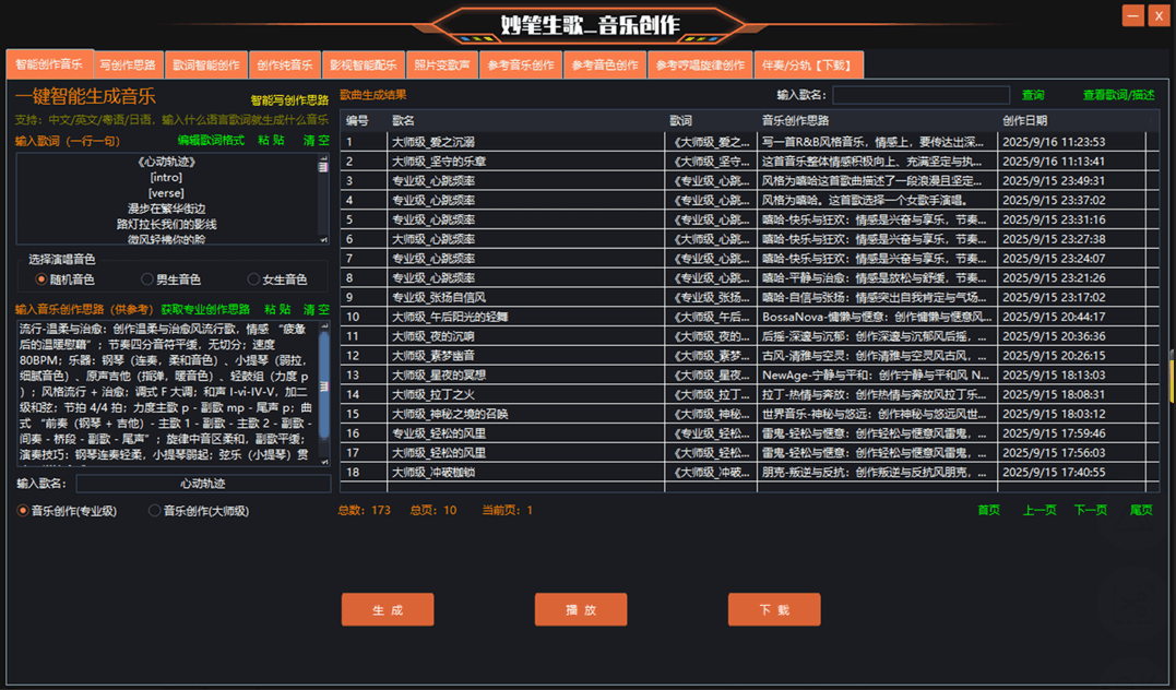 最新消息:“妙笔生词”原来是专门写歌词的软件,现在我们推出最新智能写音乐软件《妙笔生歌》(下载网站:www.musicsoft.cn),智能创作歌词+智能演唱歌词,一键创作发行级音乐。国内首个利用专业创作思路来智能生成完整音乐创作的软件,每一首歌均能达到发行级效果。功能如下:智能创作音乐,写创作思路,纯音乐创作,影视智能配乐,照片变歌声,模仿音乐创作,音色克隆创作音乐,参考哼唱旋律创作音乐,生成伴奏分轨下载,歌词智能创作。